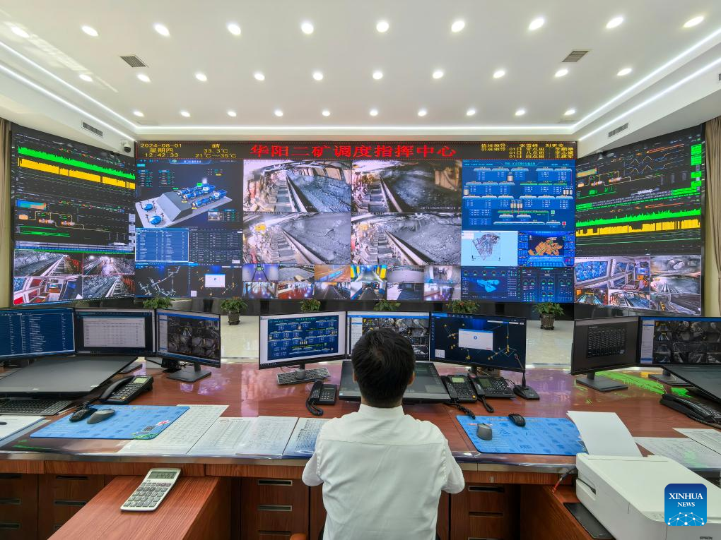 Staff members work at the production dispatch center of the Huayang No. 2 Coal Mine in Yangquan City, north China's Shanxi Province, Aug. 1, 2024. (Xinhua/Li Xin)
