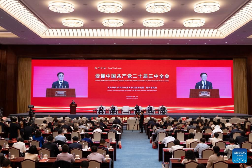 This photo taken on Aug. 6, 2024 shows a view of the symposium themed on understanding the third plenum of the 20th Communist Party of China (CPC) Central Committee in Beijing, capital of China. The symposium was attended by more than 200 diplomats, think tank experts and journalists from over 60 countries for exchanges and discussions on Tuesday in Beijing. A think tank report on the achievements and global contributions of China's reform endeavors in the new era was unveiled at the symposium. Titled "Deepening Reform Comprehensively to Advance Chinese Modernization: Major Achievements and Global Contributions," the report was jointly issued in Chinese and English by the think tanks under the Institute of Party History and Literature of the CPC Central Committee and Xinhua News Agency. (Xinhua/Cai Yang)