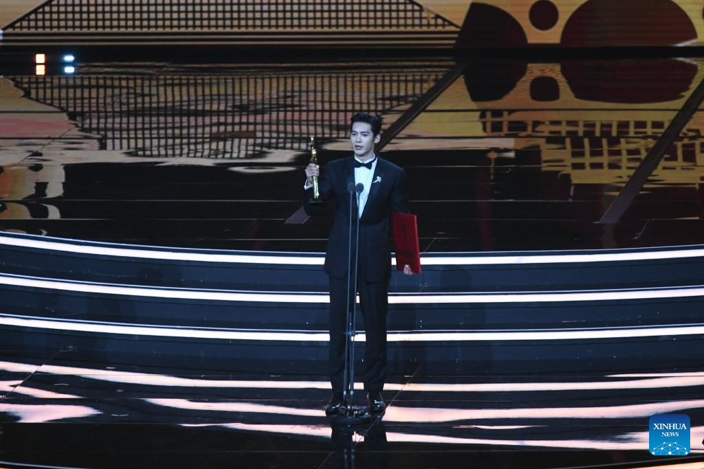 Yu Shi acknowledges receiving the Best New Talent Award for his role in the film "Creation of the Gods I: Kingdom of Storms" at the awards ceremony of the 37th Hundred Flowers Awards in Chengdu, southwest China's Sichuan Province, Aug. 4, 2024. (Xinhua/Tang Wenhao)