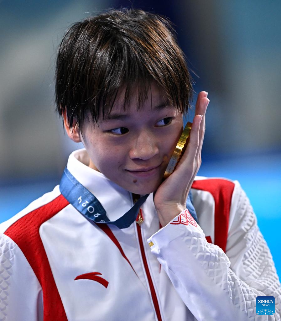 Gold medalist Quan Hongchan of China celebrates during the awarding ceremony after the women's 10m platform final of diving at the Paris 2024 Olympic Games in Saint-Denis, France, Aug. 6, 2024. (Xinhua/Wang Peng)