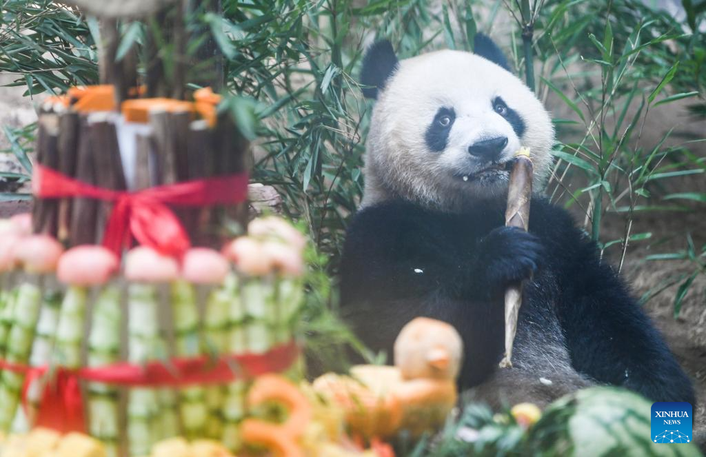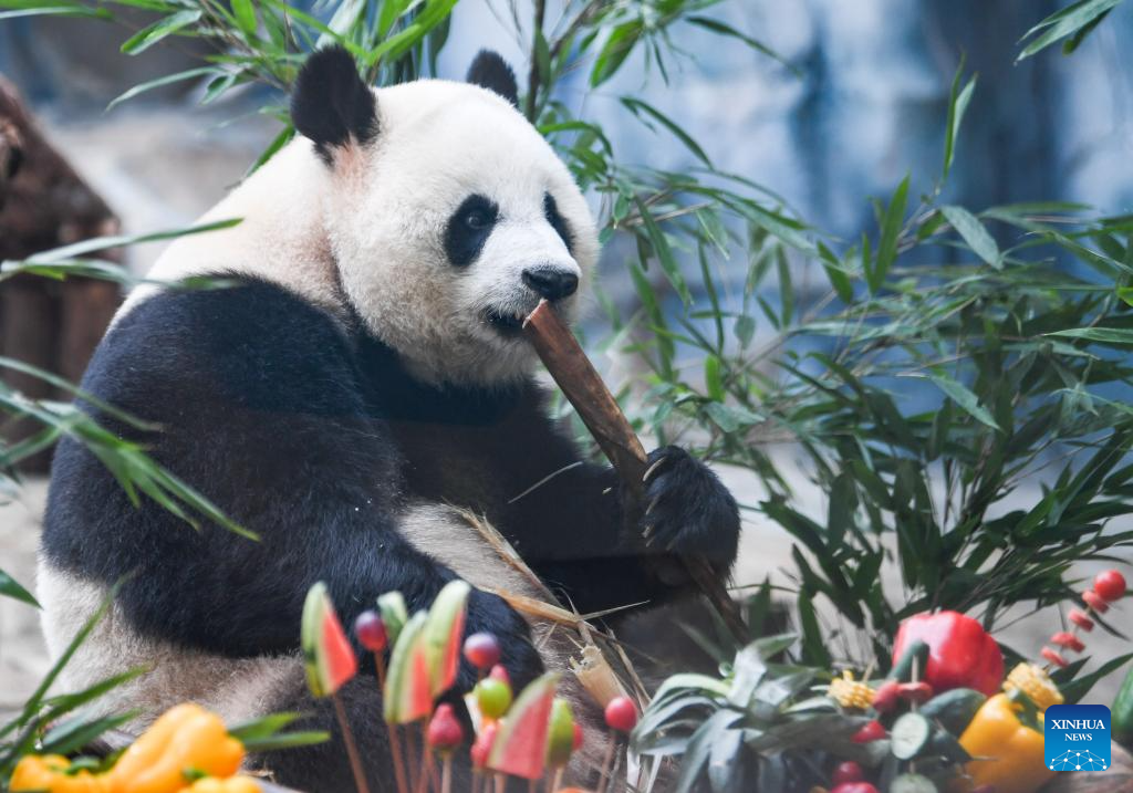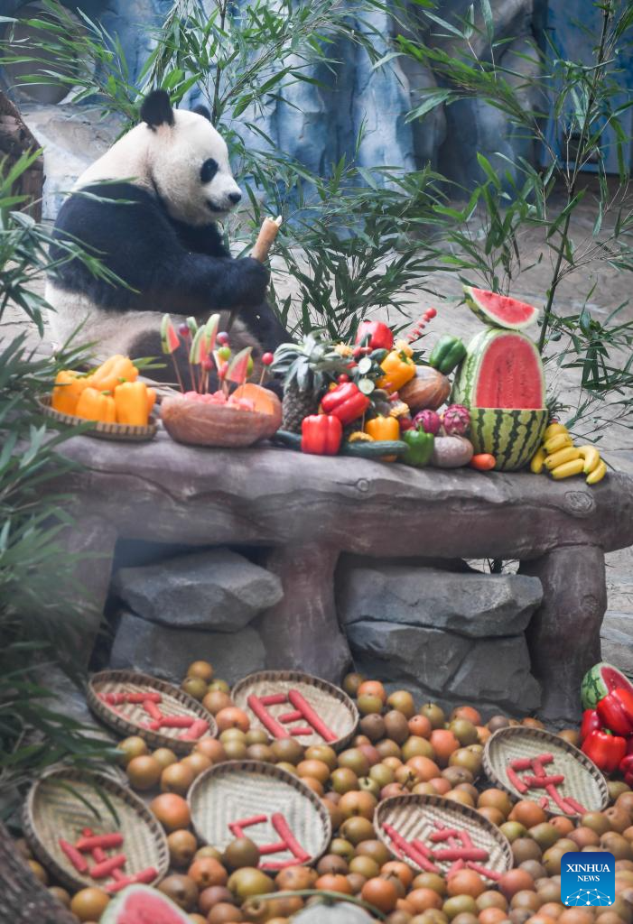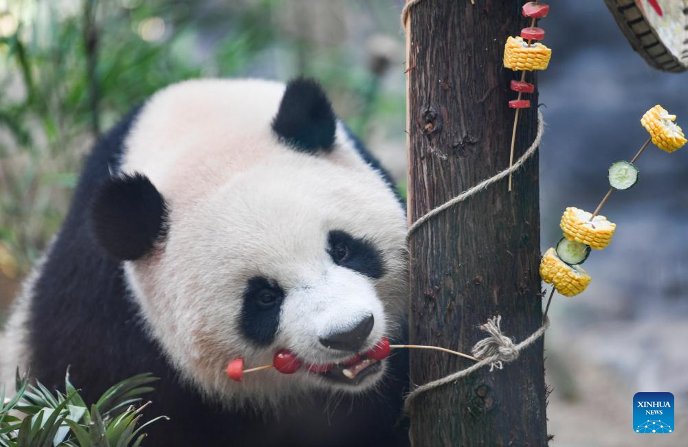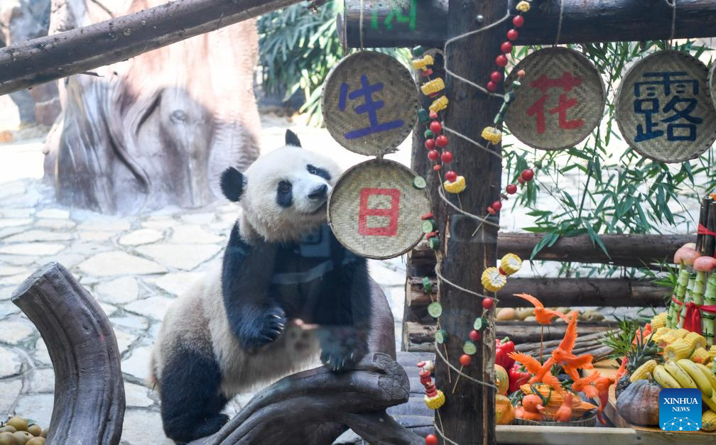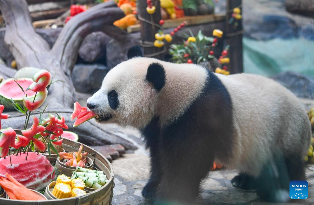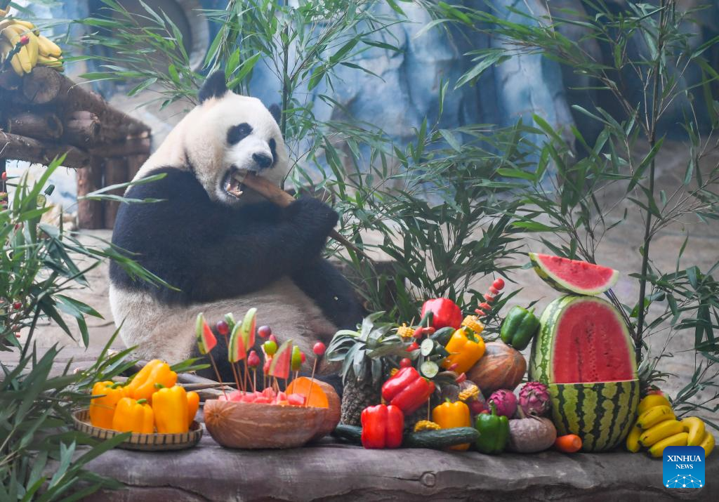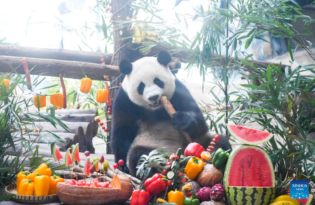Giant panda Qiao Yue enjoys a birthday treat at Locajoy animal theme park in Yongchuan district of southwest China's Chongqing Municipality, Aug. 6, 2024. A special event was held to celebrate the birthdays of 3-year-old twin pandas Qing Hua, Qing Lu and 6-year-old panda Qiao Yue here on Tuesday. (Xinhua/Wang Quanchao)