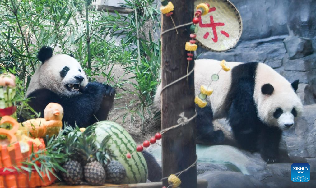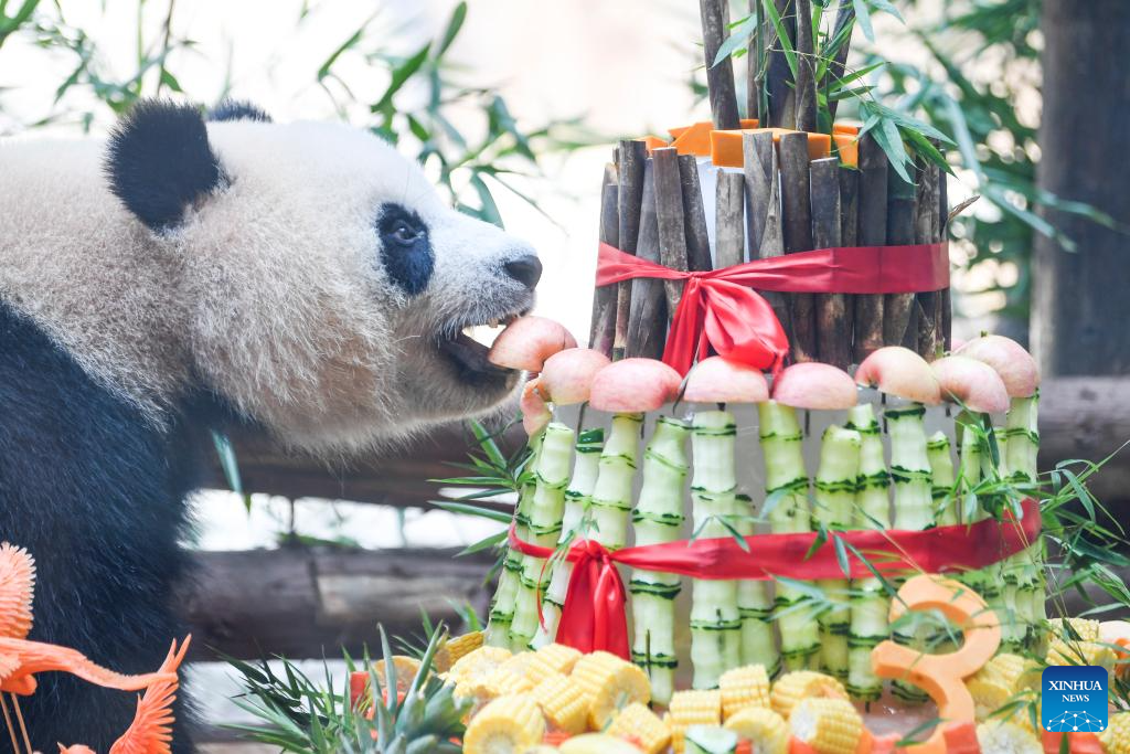 Giant panda Qing Hua enjoys a birthday treat at Locajoy animal theme park in Yongchuan district of southwest China's Chongqing Municipality, Aug. 6, 2024. A special event was held to celebrate the birthdays of 3-year-old twin pandas Qing Hua, Qing Lu and 6-year-old panda Qiao Yue here on Tuesday. (Xinhua/Wang Quanchao)