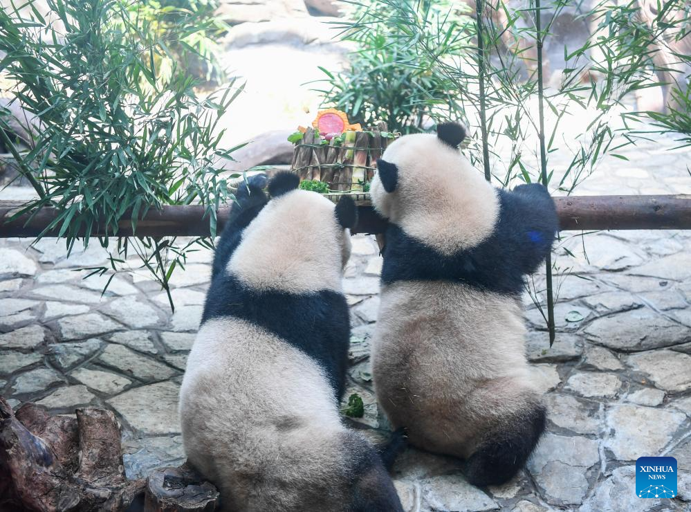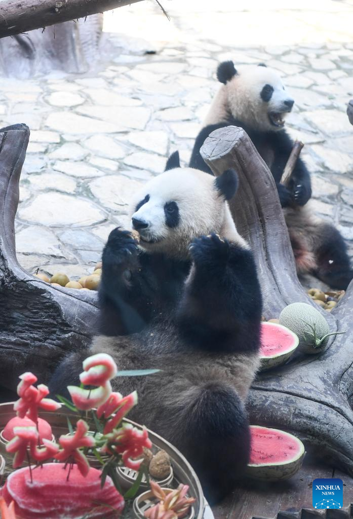 Twin giant pandas Qing Hua and Qing Lu are pictured at a birthday treat at Locajoy animal theme park in Yongchuan district of southwest China's Chongqing Municipality, Aug. 6, 2024. A special event was held to celebrate the birthdays of 3-year-old twin pandas Qing Hua, Qing Lu and 6-year-old panda Qiao Yue here on Tuesday. (Xinhua/Wang Quanchao)