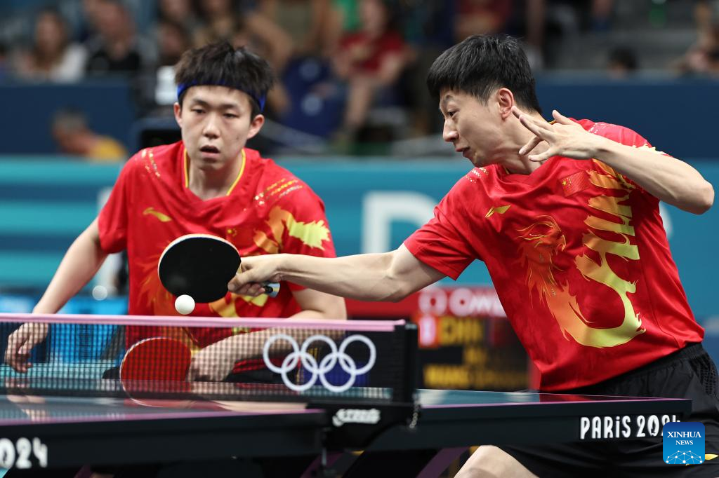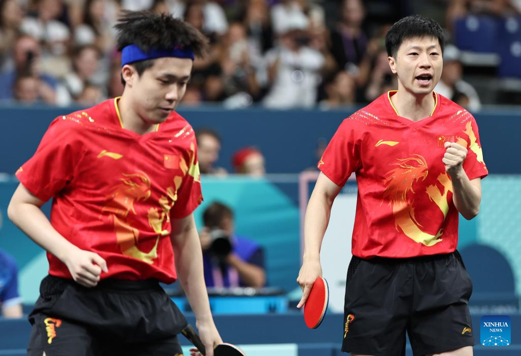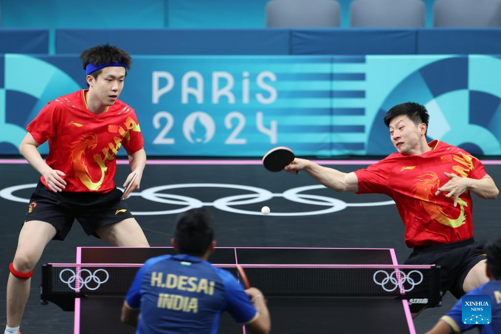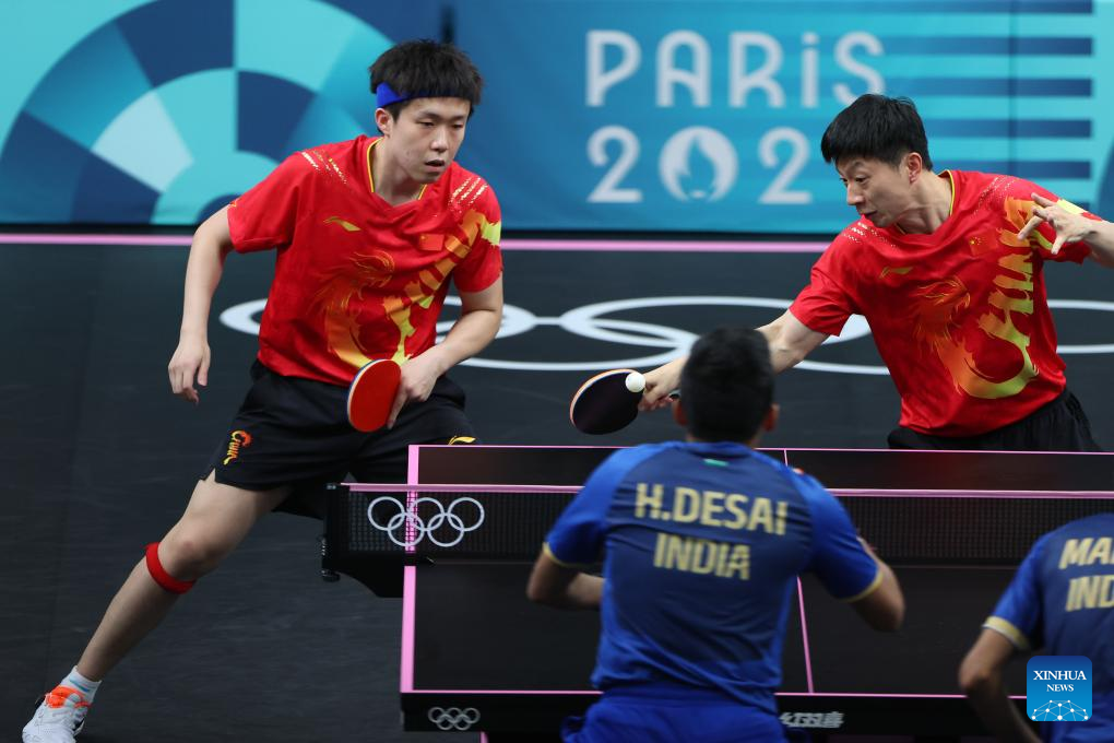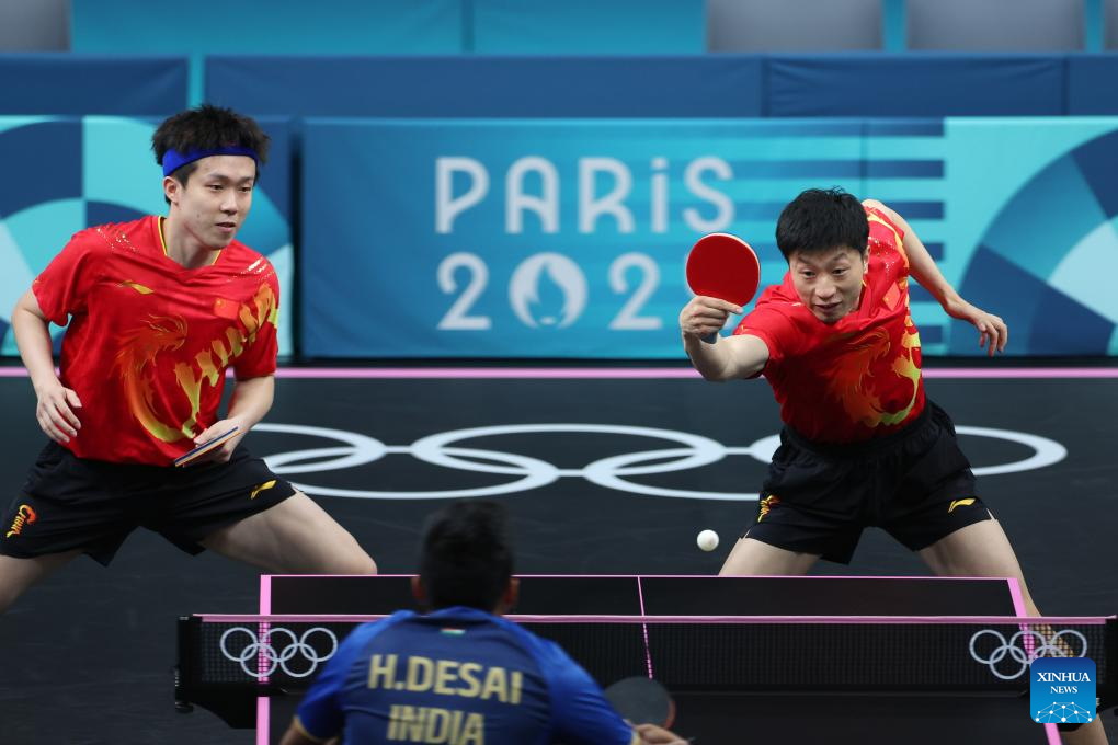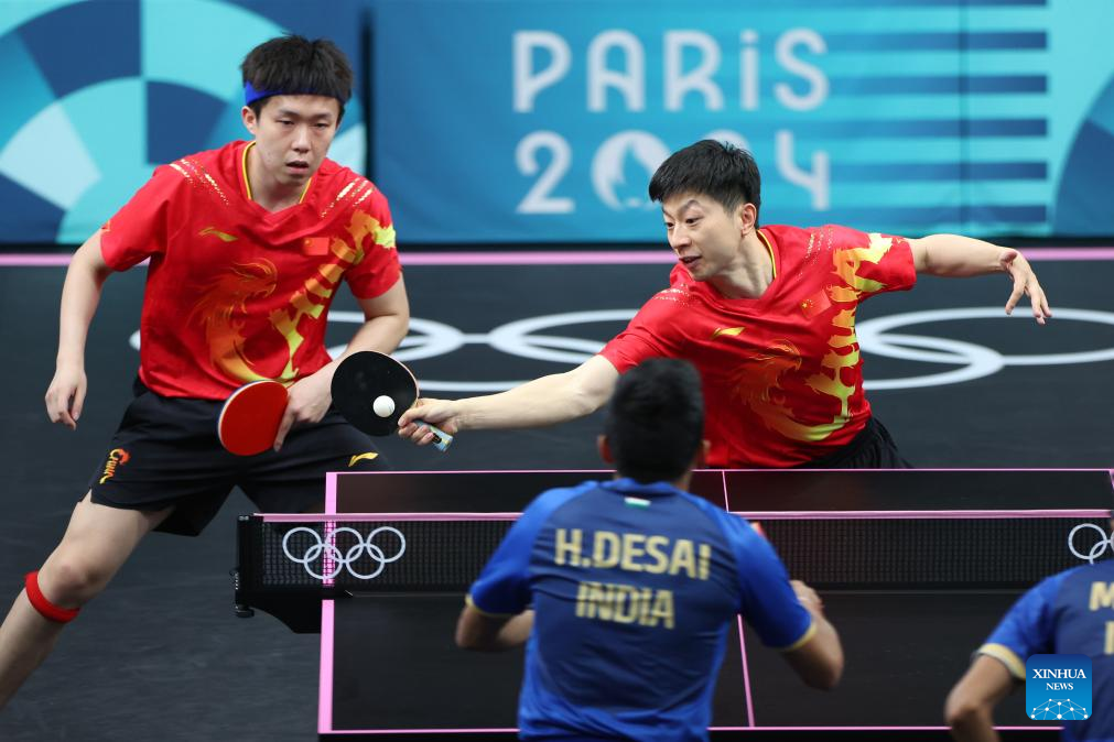 Ma Long (R)/Wang Chuqin of China compete against Harmeet Desai/Manav Vikash Thakkar of India during the men's team round of 16 match of table tennis between China and India at the Paris 2024 Olympic Games in Paris, France, on Aug. 6, 2024. (Xinhua/Wang Dongzhen)
