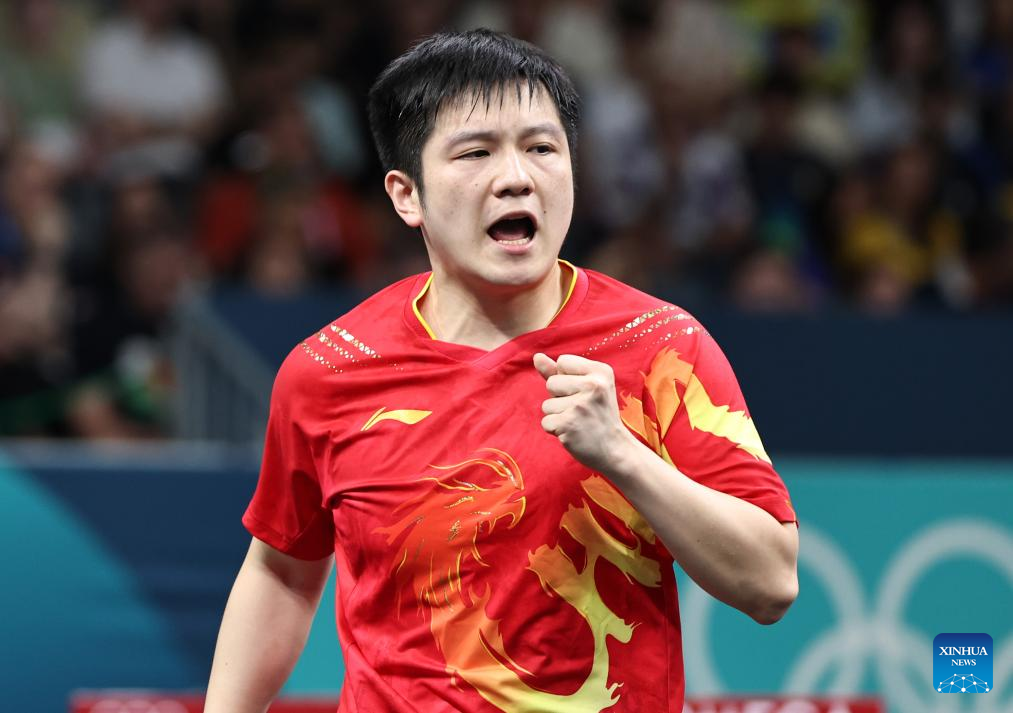 Fan Zhendong of China reacts while competing against Sharath Kamal Achanta of India during the men's team round of 16 match of table tennis between China and India at the Paris 2024 Olympic Games in Paris, France, on Aug. 6, 2024. (Xinhua/Wang Dongzhen)