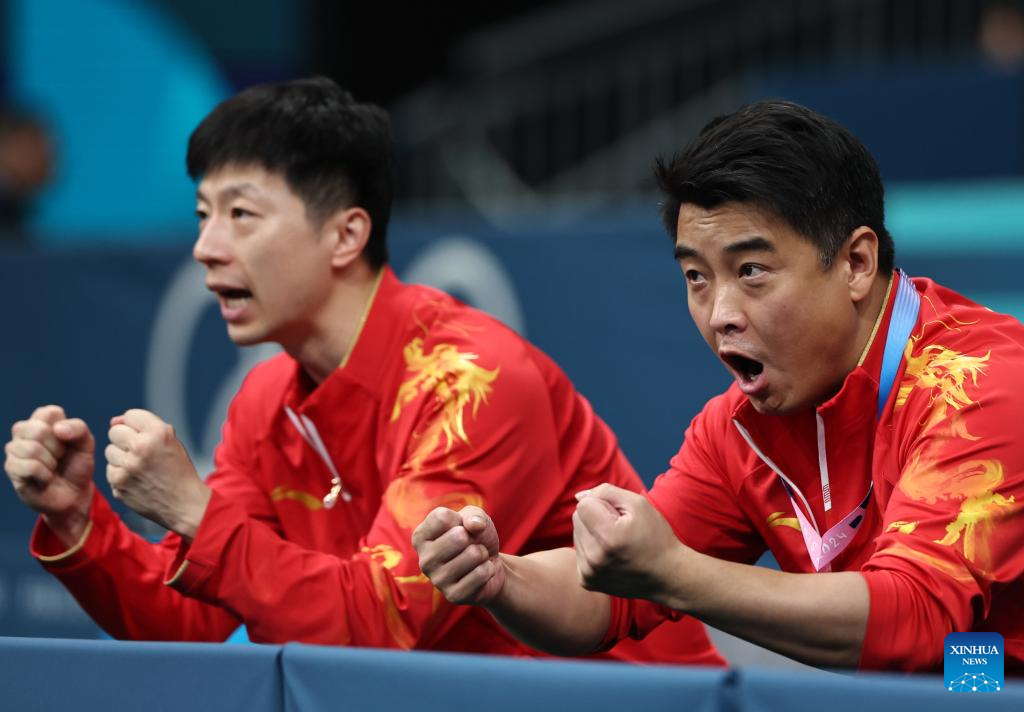 Coach Wang Hao (R) and player Ma Long of China react during the men's team round of 16 match of table tennis between China and India at the Paris 2024 Olympic Games in Paris, France, on Aug. 6, 2024. (Xinhua/Wang Dongzhen)
