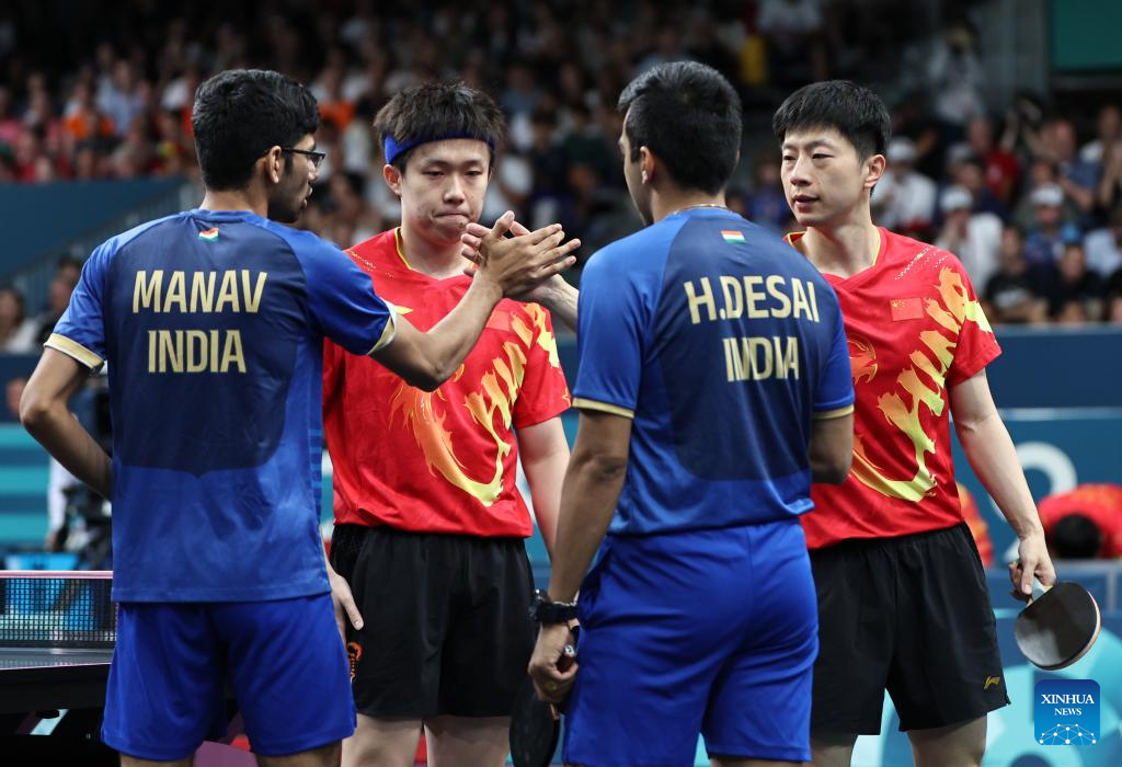 Ma Long (R, top)/Wang Chuqin (L, top) of China compete against Harmeet Desai/Manav Vikash Thakkar of India during the men's team round of 16 match between China and India at the Paris 2024 Olympic Games in Paris, France, on Aug. 6, 2024. (Xinhua/Liu Xu)