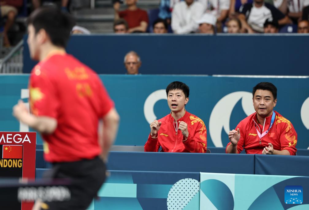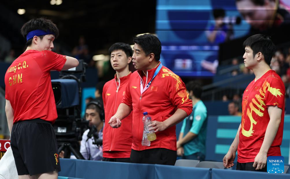 Coach Wang Hao (C) of China reacts during the men's team round of 16 match of table tennis between China and India at the Paris 2024 Olympic Games in Paris, France, on Aug. 6, 2024. (Xinhua/Wang Dongzhen)