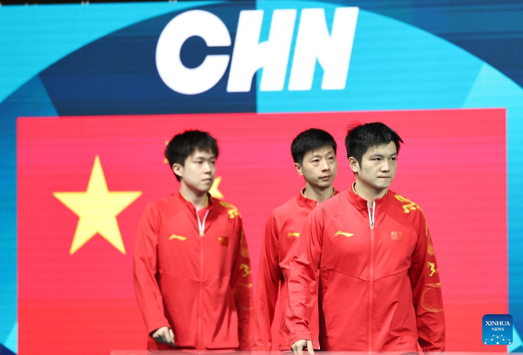 Athletes of China are seen before the men's team round of 16 match of table tennis between China and India at the Paris 2024 Olympic Games in Paris, France, on Aug. 6, 2024. (Xinhua/Wang Dongzhen)