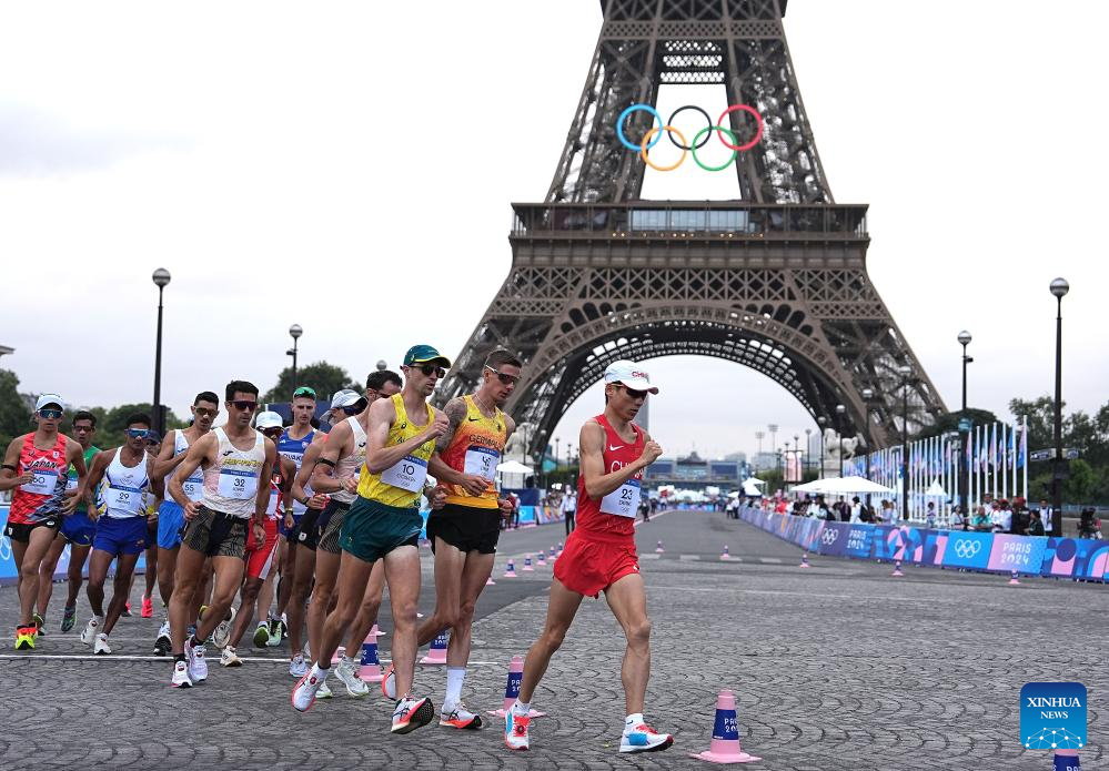 Athletes compete during the marathon race walk relay mixed of Athletics at the Paris 2024 Olympic Games in Paris, France, Aug. 7, 2024. (Xinhua/Xu Chang)