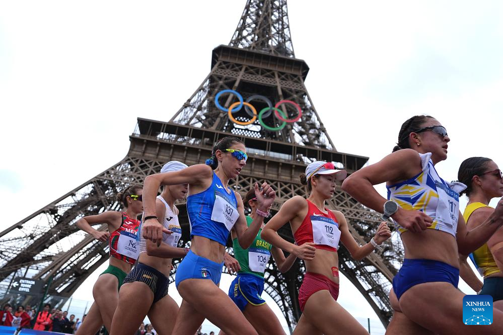 Athletes compete during the marathon race walk relay mixed of Athletics at the Paris 2024 Olympic Games in Paris, France, Aug. 7, 2024. (Xinhua/Song Yanhua)