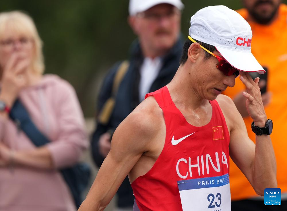 Zhang Jun of China reacts during the marathon race walk relay mixed of Athletics at the Paris 2024 Olympic Games in Paris, France, Aug. 7, 2024. (Xinhua/Li Jing)