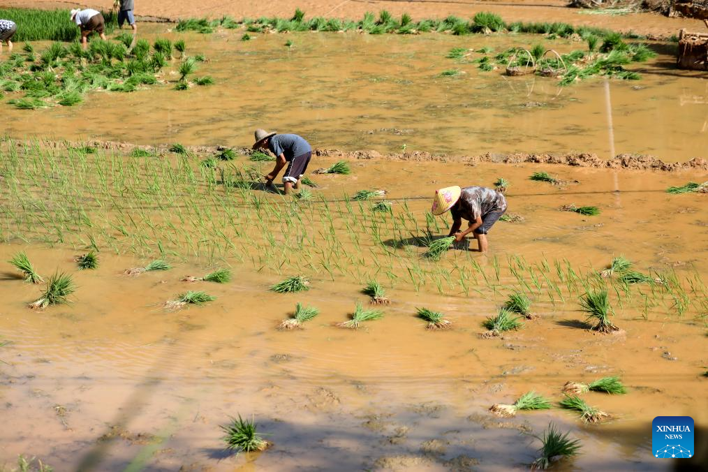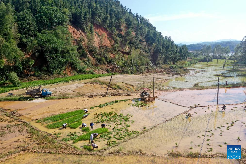Villagers transplant rice seedlings in Xingning Town of Zixing City, central China's Hunan Province, Aug. 7, 2024. Communication and power supplies have largely resumed in Zixing, a county-level city in Hunan Province. Rainstorms have wreaked havoc in Hunan since late July, triggering flash floods and landslides that destroyed homes and severed roads. (Photo by Li Ke/Xinhua)