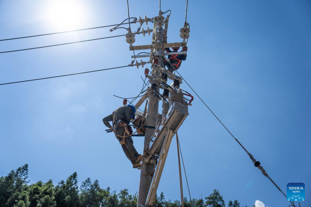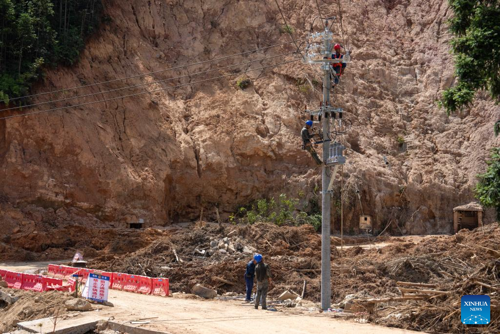 Workers repair electric power facilities in Zhoumensi Town of Zixing City, central China's Hunan Province, Aug. 7, 2024. Communication and power supplies have largely resumed in Zixing, a county-level city in Hunan Province. Rainstorms have wreaked havoc in Hunan since late July, triggering flash floods and landslides that destroyed homes and severed roads. (Xinhua/Chen Sihan)
