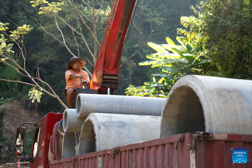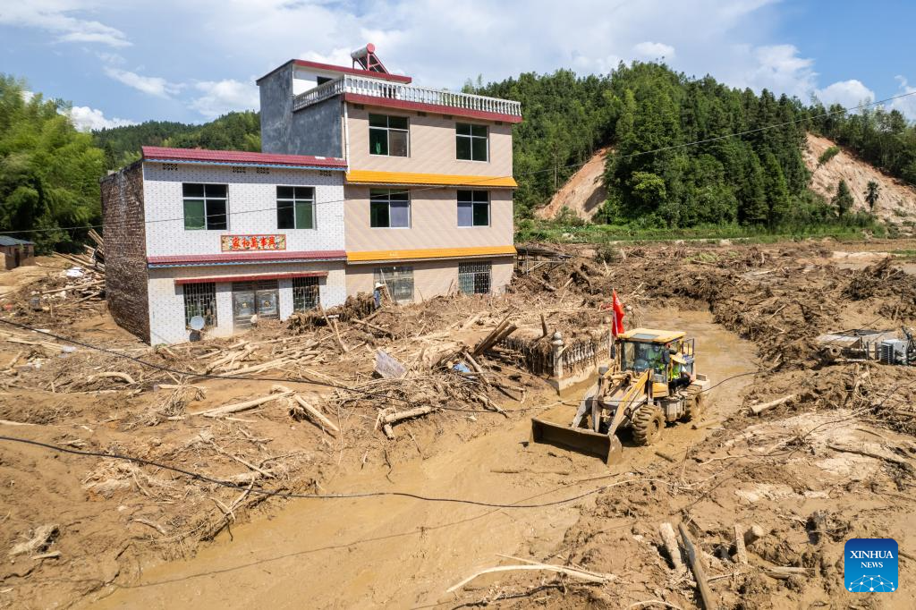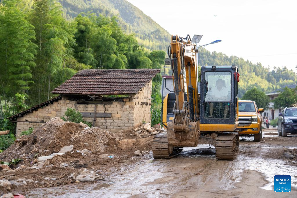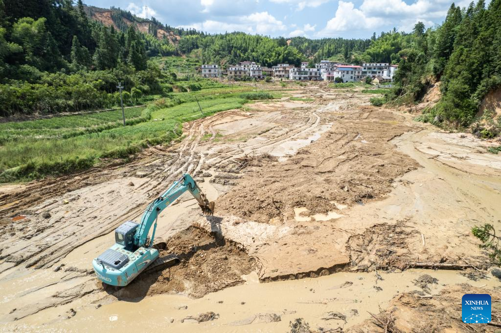 Workers repair a damaged road in Bailang Town of Zixing City, central China's Hunan Province, Aug. 7, 2024. Communication and power supplies have largely resumed in Zixing, a county-level city in Hunan Province. Rainstorms have wreaked havoc in Hunan since late July, triggering flash floods and landslides that destroyed homes and severed roads. (Xinhua/Chen Sihan)