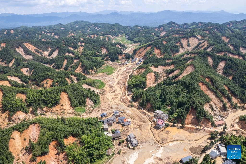 An aerial drone photo taken on Aug. 7, 2024 shows the disaster-affected areas in Zhoumensi Town of Zixing City, central China's Hunan Province. Communication and power supplies have largely resumed in Zixing, a county-level city in Hunan Province. Rainstorms have wreaked havoc in Hunan since late July, triggering flash floods and landslides that destroyed homes and severed roads. (Xinhua/Chen Sihan)