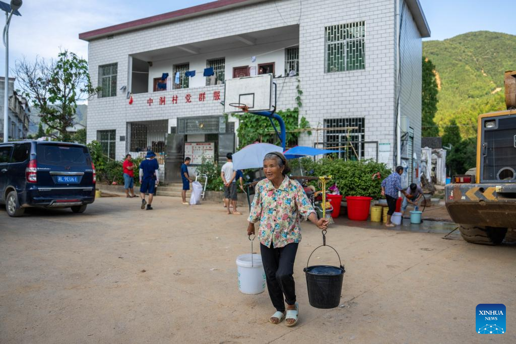 Villagers carry barrels of water in Zhongdong Village of Bailang Town, Zixing City, central China's Hunan Province, Aug. 7, 2024. Communication and power supplies have largely resumed in Zixing, a county-level city in Hunan Province. Rainstorms have wreaked havoc in Hunan since late July, triggering flash floods and landslides that destroyed homes and severed roads. (Xinhua/Chen Sihan)