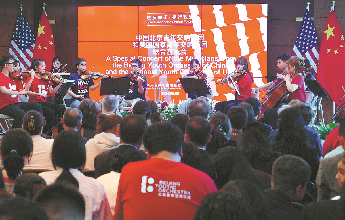 Young musicians perform on Tuesday at the Chinese Consulate General in New York, the United States. More than 100 musicians from the Beijing Youth Orchestra jointly performed with members of the National Youth Orchestra of the USA during the event. MINLU ZHANG/CHINA DAILY