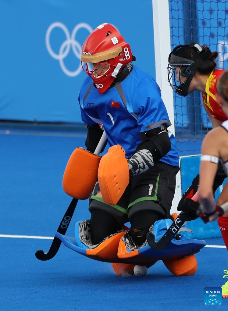 Goal keeper Ye Jiao makes a save during the women's hockey semi-final match between China and Belgium at the Paris 2024 Olympic Games in Colombes, France, Aug. 7, 2024. (Xinhua/Ren Pengfei)