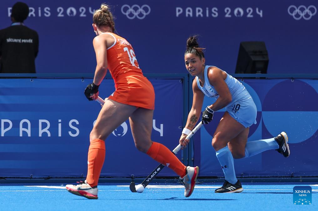 Maria Granatto (L) of Argentina vies for the ball during the women's hockey semi-final match between the Netherlands and Argentina at the Paris 2024 Olympic Games in Colombes, France, Aug. 7, 2024. (Xinhua/Ren Pengfei)