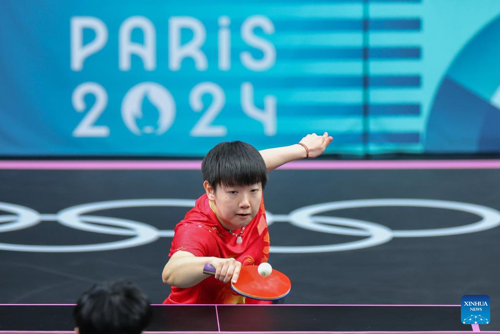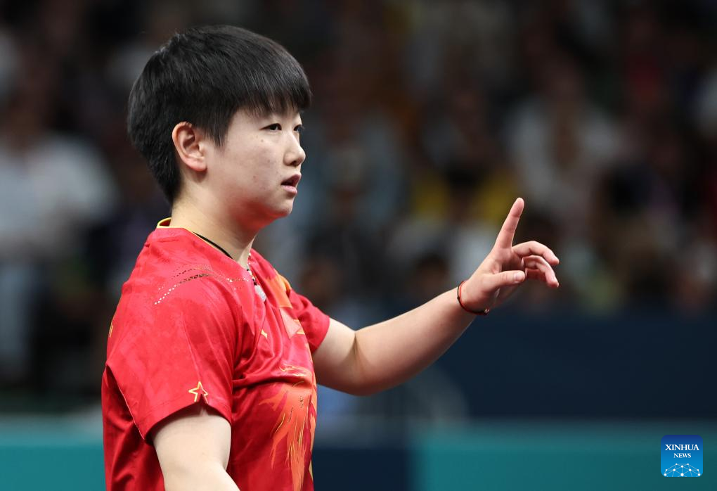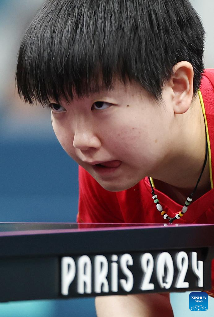 Sun Yingsha of China competes against Cheng I-Ching of Chinese Taipei during the women's team quarterfinal of table tennis between China and Chinese Taipei at the Paris 2024 Olympic Games in Paris, France, on Aug. 7, 2024. (Xinhua/Liu Xu)