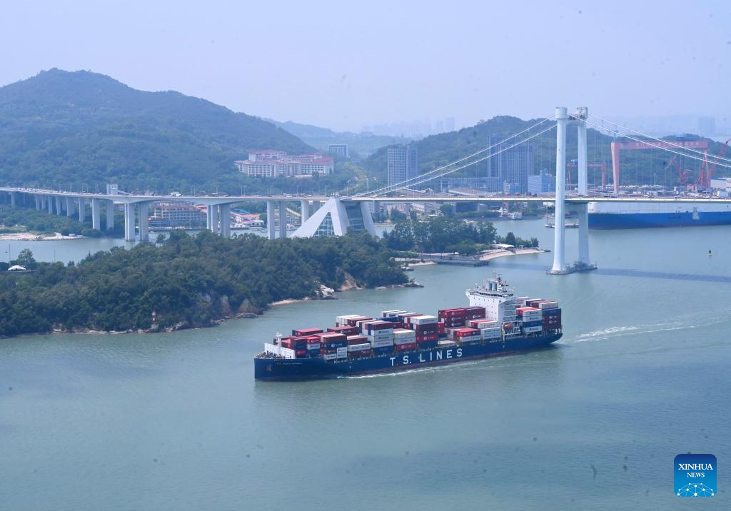 A container ship departing from Xiamen Port sails past the Haicang Bridge in Xiamen, southeast China's Fujian Province, Aug. 6, 2024. Xiamen Port has made its fully intelligent transformation in recent years. The container throughput of the port reached 12.55 million twenty-foot equivalent unit (TEU) in 2023. (Xinhua/Lin Shanchuan)