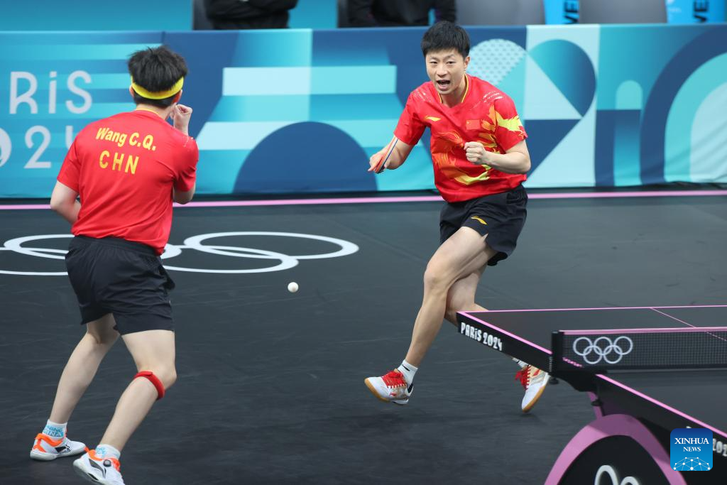 Ma Long (R)/Wang Chuqin of China react while competing against Cho Daeseong/Jang Woojin of South Korea during the men's team quarterfinal of table tennis between China and South Korea at the Paris 2024 Olympic Games in Paris, France, on Aug. 7, 2024. (Xinhua/Wang Dongzhen)