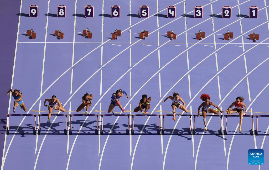 Athletes compete during the women's heptathlon 100m hurdles of Athletics at the Paris 2024 Olympic Games in Paris, France, Aug. 8, 2024. (Xinhua/Li Ying)