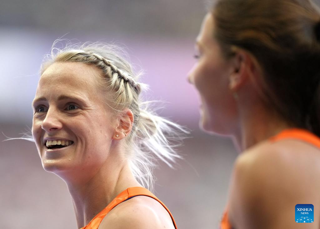 Anouk Vetter (L) of the Netherlands reacts after the women's heptathlon 100m hurdles of Athletics at the Paris 2024 Olympic Games in Paris, France, Aug. 8, 2024. (Xinhua/Lui Siu Wai)
