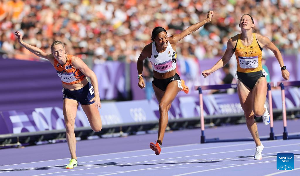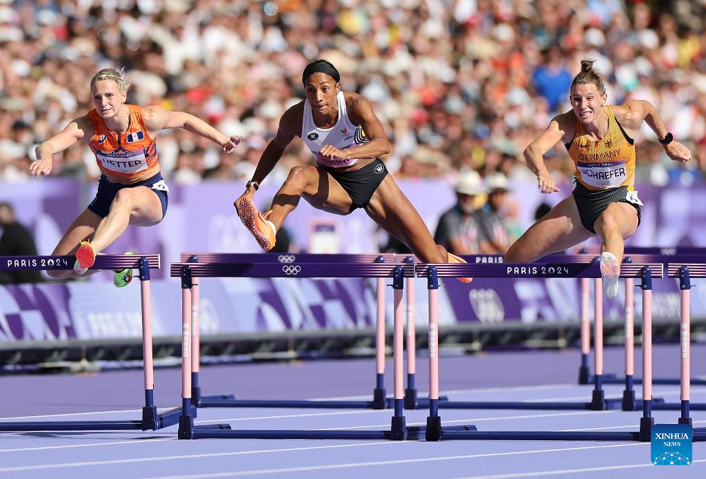 (L to R)Anouk Vetter of the Netherlands, Nafissatou Thiam of Belgium and Carolin Schaefer of Germany compete during the women's heptathlon 100m hurdles of Athletics at the Paris 2024 Olympic Games in Paris, France, Aug. 8, 2024. (Xinhua/Li Gang)