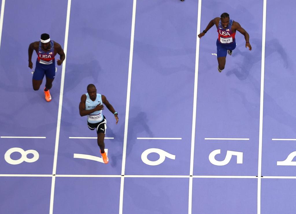 Letsile Tebogo (C) of Botswana, Kenneth Bednarek (L) and Noah Lyles of the United States compete during the men's 200m final at the Paris Olympics on Aug. 8, 2024. (Xinhua/Li Ying)