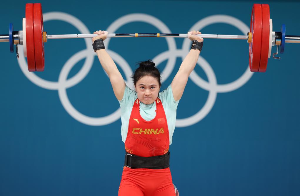 Luo Shifang of China competes during the weightlifting women's 59kg competition at the Paris Olympics on Aug. 8, 2024. (Xinhua/Yang Lei)