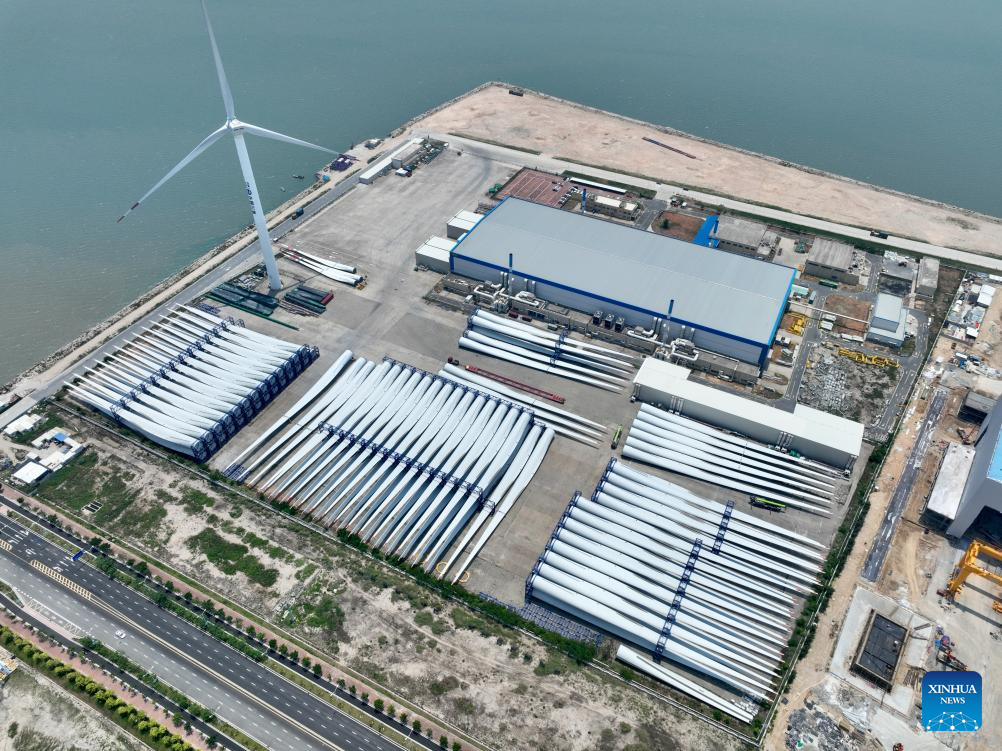 An aerial drone photo taken on Aug. 8, 2024 shows a view of the Fujian Three Gorges Offshore Wind Power International Industrial Park in Fuqing City, southeast China's Fujian Province. The industrial park, with a total investment of 4 billion yuan (about 557.7 million U.S. dollars), is the first full-industry-chain offshore wind power industrial park in China. (Xinhua/Jiang Kehong)