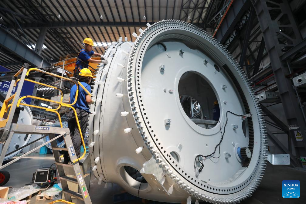 Workers of Dongfang Electric Wind Power Co., Ltd. produce offshore wind turbines of 18-megawatt at the Fujian Three Gorges Offshore Wind Power International Industrial Park in Fuqing City, southeast China's Fujian Province, Aug. 8, 2024. The industrial park, with a total investment of 4 billion yuan (about 557.7 million U.S. dollars), is the first full-industry-chain offshore wind power industrial park in China. (Xinhua/Jiang Kehong)