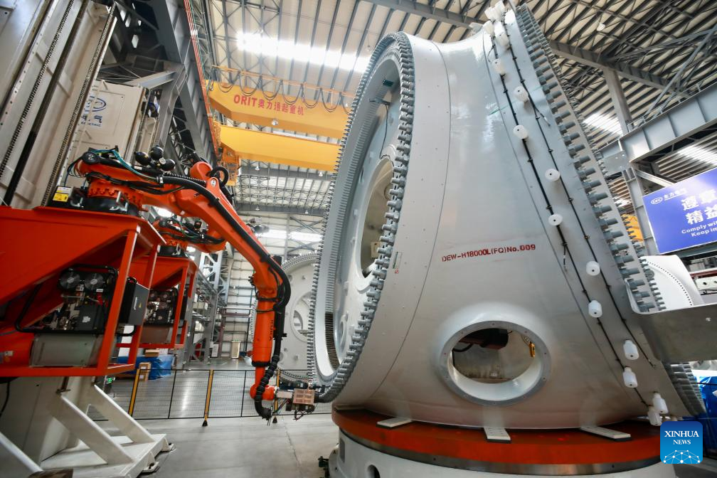 A robotic arm produces offshore wind turbines of 18-megawatt at the Fujian Three Gorges Offshore Wind Power International Industrial Park in Fuqing City, southeast China's Fujian Province, Aug. 8, 2024. The industrial park, with a total investment of 4 billion yuan (about 557.7 million U.S. dollars), is the first full-industry-chain offshore wind power industrial park in China. (Xinhua/Jiang Kehong)