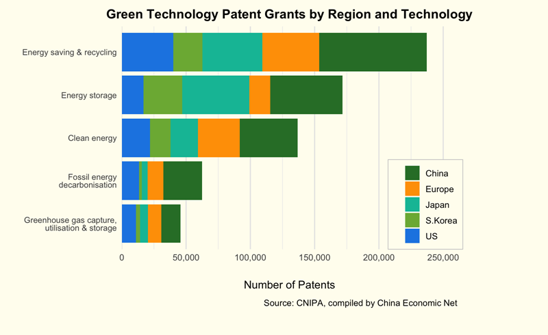 The report revealed that China has also dominated all the five sectors of green technology patents: fossil fuel decarbonisation, energy conservation and recycling, clean energy, energy storage, and greenhouse gas capture, utilisation, and storage.