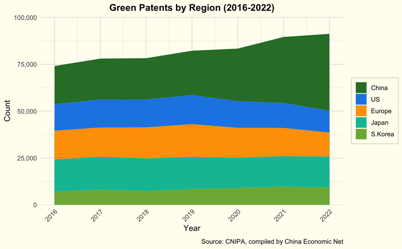 Over the same period, green patents granted to Chinese applicants totalled 230,000, marking 35.1% of the five major patenting regions, followed by Japan, Europe, the U.S. and South Korea.