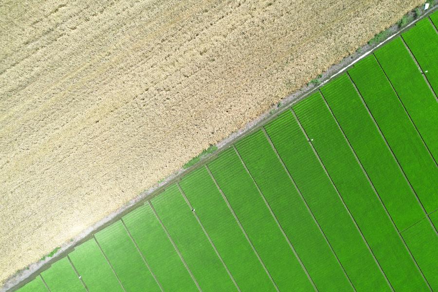 An aerial drone photo taken on May 13, 2024 shows wheat (above) and paddy fields at an agricultural industrial park in Guanghan City, southwest China's Sichuan Province. (Xinhua/Yang Jin)