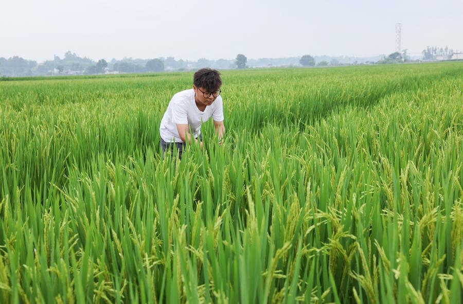 Wang Tao checks the growth of rice in Yongfeng Village of Taihe Town in Meishan City, southwest China's Sichuan Province, July 13, 2024. (Photo by Yao Yongliang/Xinhua)