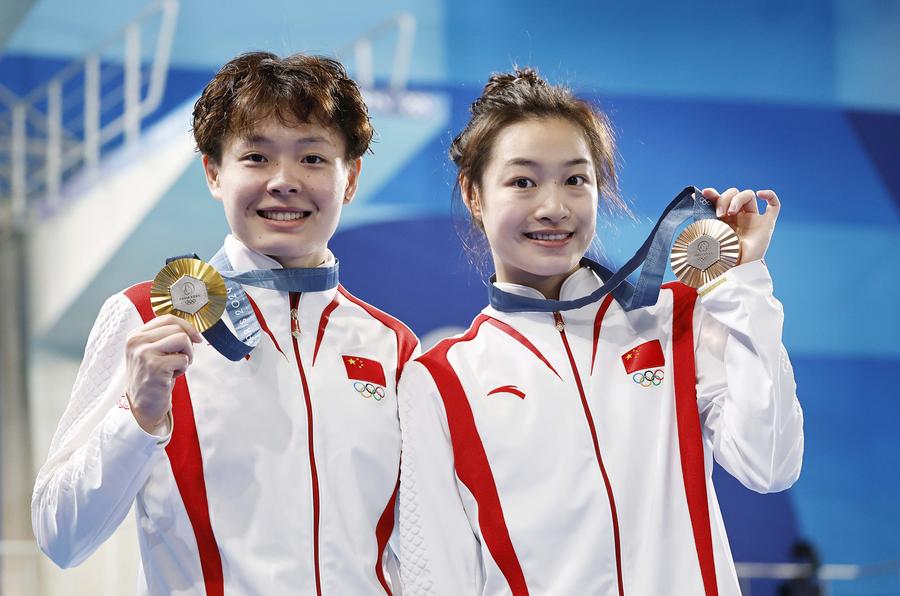Gold medalist Chen Yiwen (L) and bronze medalist Chang Yani of China pose for photos after the awarding ceremony of the women's 3m springboard final of diving at the Paris 2024 Olympic Games in Saint-Denis, France, Aug. 9, 2024. (Xinhua/Zhang Yuwei)