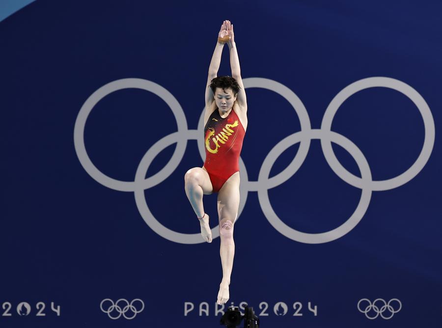 Chen Yiwen of China competes during the women's 3m springboard final of diving at the Paris 2024 Olympic Games in Saint-Denis, France, Aug. 9, 2024. (Xinhua/Wang Peng)