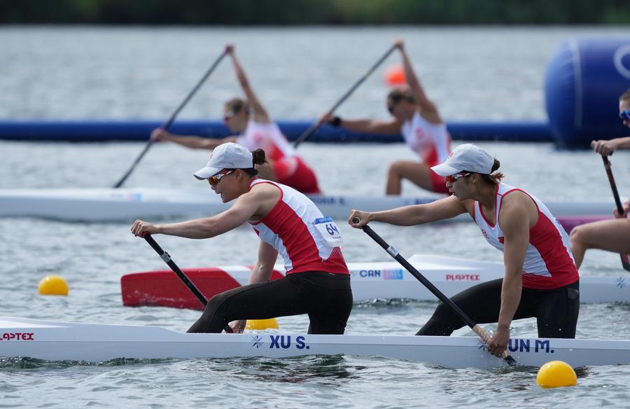 Xu Shixiao (L)/Sun Mengya of China compete during the women's canoe double 500m final of canoe sprint at the Paris 2024 Olympic Games in Vaires-sur-Marne, France, on Aug. 9, 2024. (Xinhua/Shen Bohan)