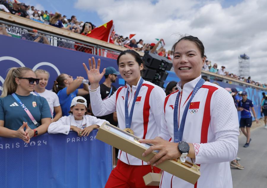 Gold medalists Xu Shixiao (R)/Sun Mengya of China attend the awarding ceremony after the women's canoe double 500m final of canoe sprint at the Paris 2024 Olympic Games in Vaires-sur-Marne, France, on Aug. 9, 2024. (Xinhua/Shen Bohan)
