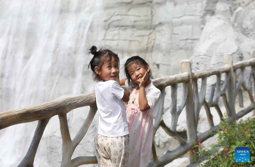 Children pose for photos at the Beipiao mountain park in Beipiao City, northeast China's Liaoning Province, Aug. 8, 2024. Liaoning has strengthened restoration of ecological environment and accelerated the comprehensive treatment of mines in recent years. The quarry-transformed mountain park in Beipiao provides a summer resort for visitors. (Xinhua/Yang Qing)
