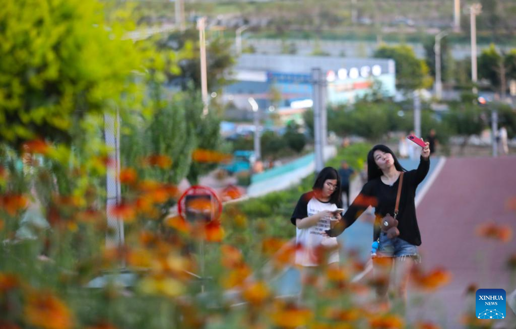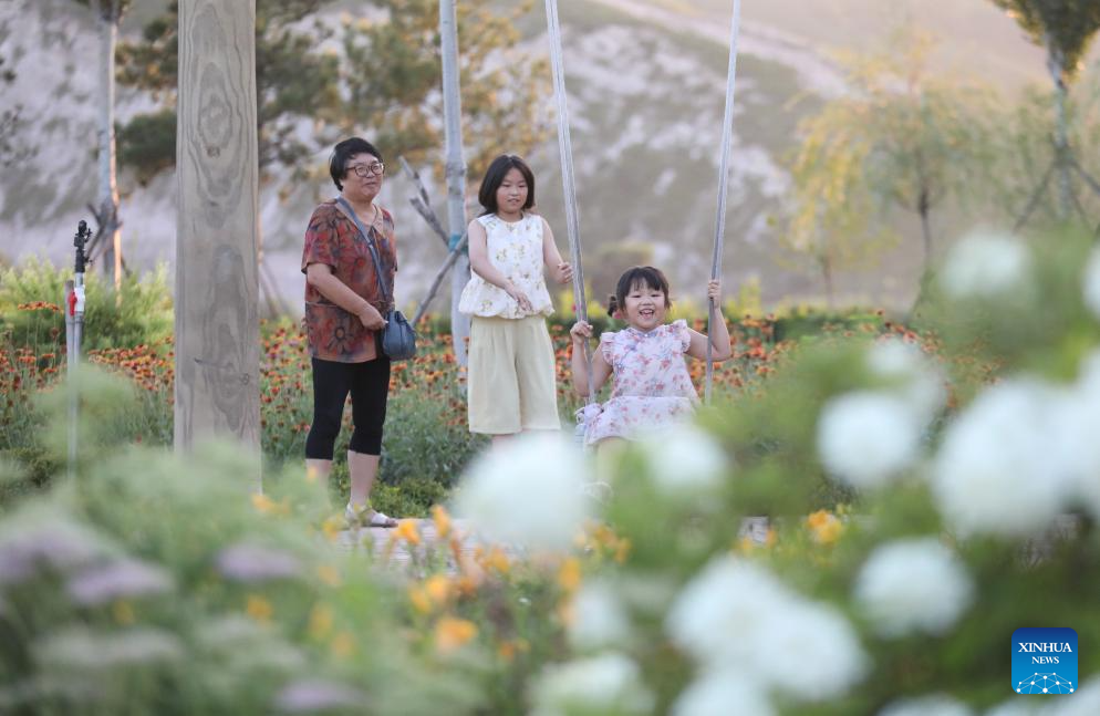 People visit the Beipiao mountain park in Beipiao City, northeast China's Liaoning Province, Aug. 8, 2024. Liaoning has strengthened restoration of ecological environment and accelerated the comprehensive treatment of mines in recent years. The quarry-transformed mountain park in Beipiao provides a summer resort for visitors. (Xinhua/Yang Qing)