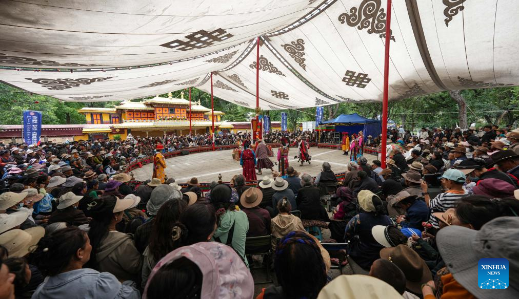 Artists stage a Tibetan opera performance at Norbulingka in Lhasa, southwest China's Xizang Autonomous Region, Aug. 8, 2024. Tibetan opera performances are staged here from Aug. 4 to Aug. 10 in celebration of the traditional Shoton Festival, or Yogurt Festival. (Xinhua/Jigme Dorje)