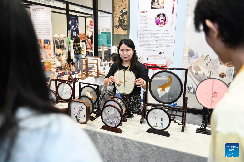 An exhibitor shows a piece of Su Xiu (Suzhou embroidery) artwork to visitors during the China Jiangsu Service Trade Expo 2024 in Kuala Lumpur, Malaysia, Aug. 9, 2024. The China Jiangsu Service Trade Expo 2024 kicked off in Kuala Lumpur on Friday, featuring Jiangsu cultural specialties, traditional Chinese medicine, gastronomy and international tourism, intellectual property, international education and business services. (Xinhua/Cheng Yiheng)