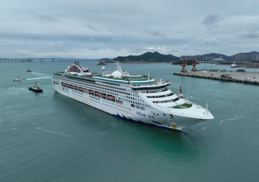 A drone photo taken on March 6, 2024 shows an international cruise ship departing from a dock in Pingtan, southeast China's Fujian Province. (Xinhua/Lin Shanchuan)
