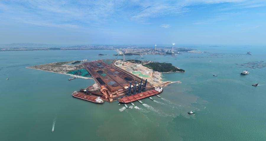 A drone photo taken on Aug. 7, 2024 shows an iron ore cargo ship from Brazil docking at a port of the Meizhou Bay of Putian City, southeast China's Fujian Province. (Xinhua/Lin Shanchuan)