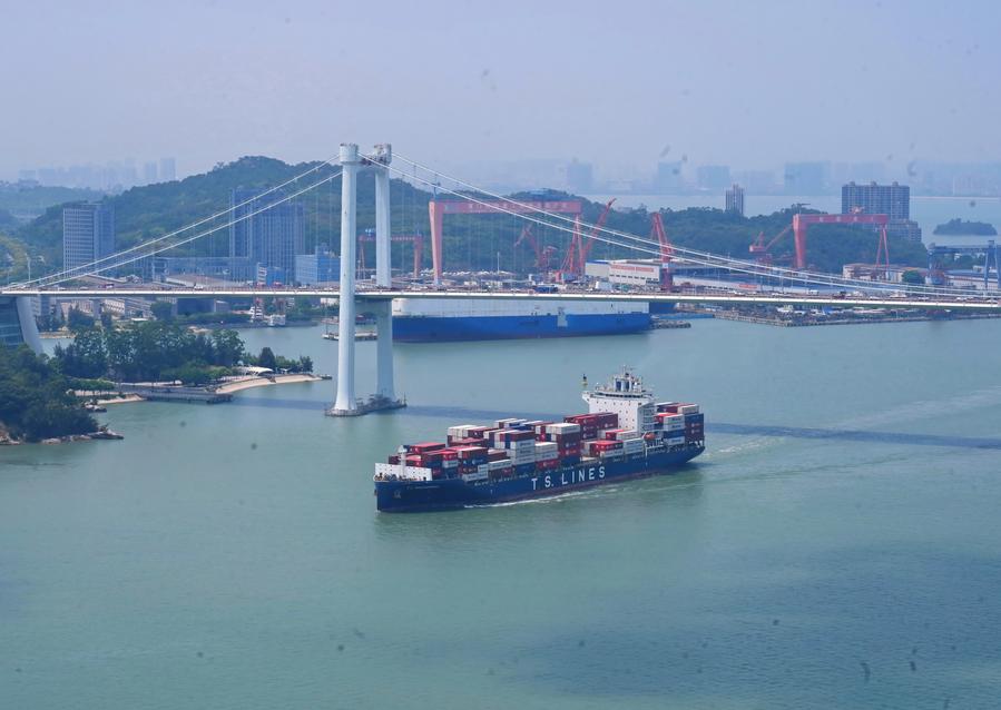 A cargo ship departing from the Xiamen port passes the Haicang Bridge in Xiamen, southeast China's Fujian Province, Aug. 6, 2024. (Xinhua/Lin Shanchuan)
